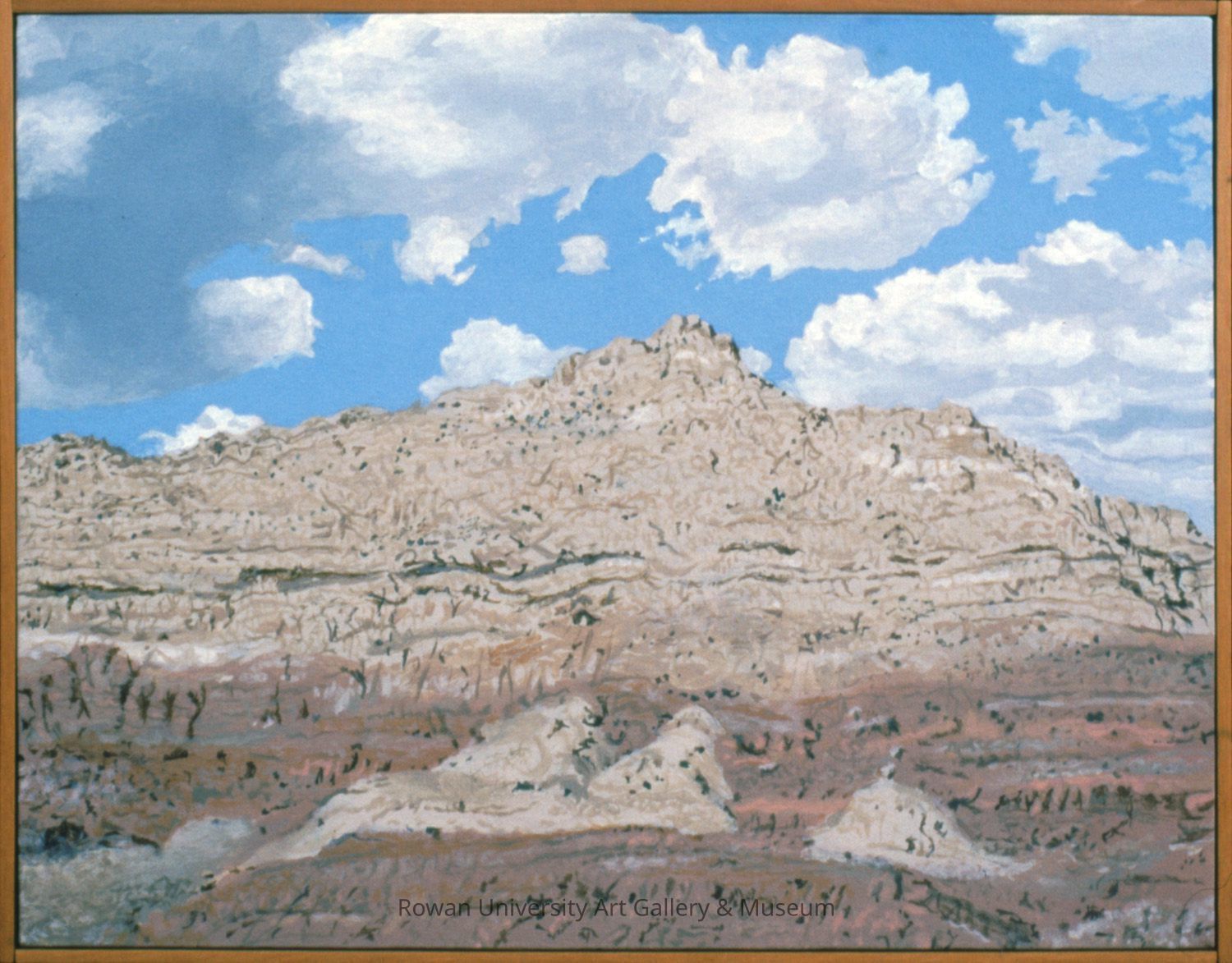 View of a stratified outcropping of rock, set against a blue sky with cloudsType of Painting