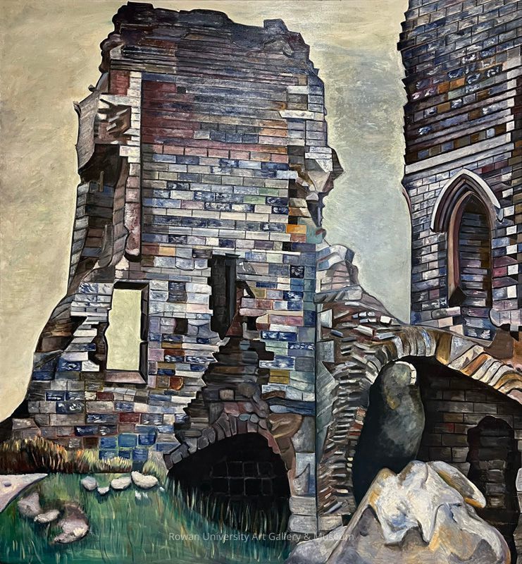 View of a castle ruin with varicolored bricks, rectangular windows, and an opening with a pointed arch, set against a mostly neutral sky; below are rocks and grassType of Painting