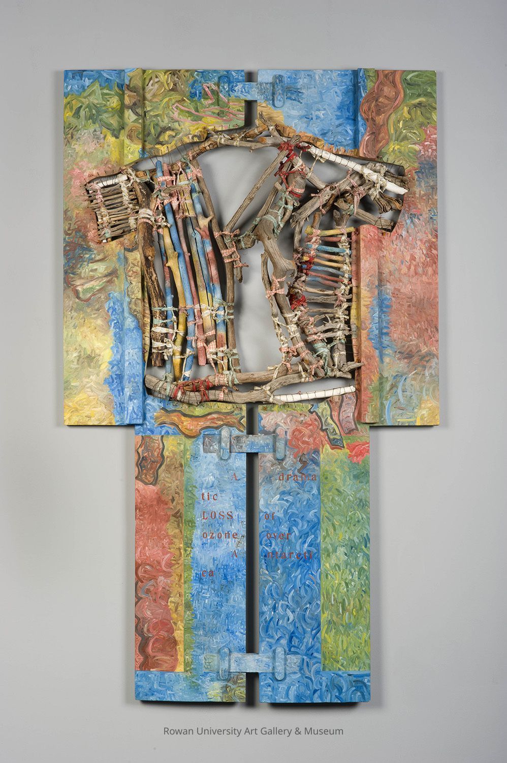 Parallel vertical rectangular forms flanked at the top by smaller vertical rectangular wings, painted with colorful abstract forms; in the upper half, a central cutout shape of a short-sleeve shirt is partly filled with clusters of painted and unpainted desert wood that are tied together with fabric