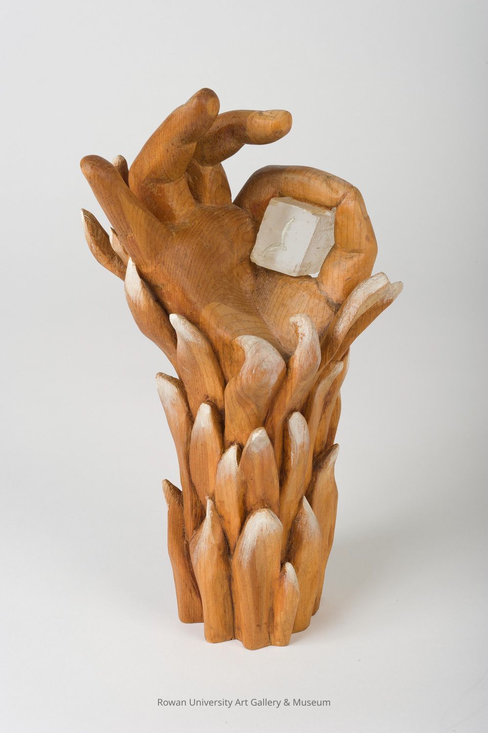 Carved wood hand emerging from a leaf-like sheath, with thumb and index finger touching at the tips to hold a calcite cube
