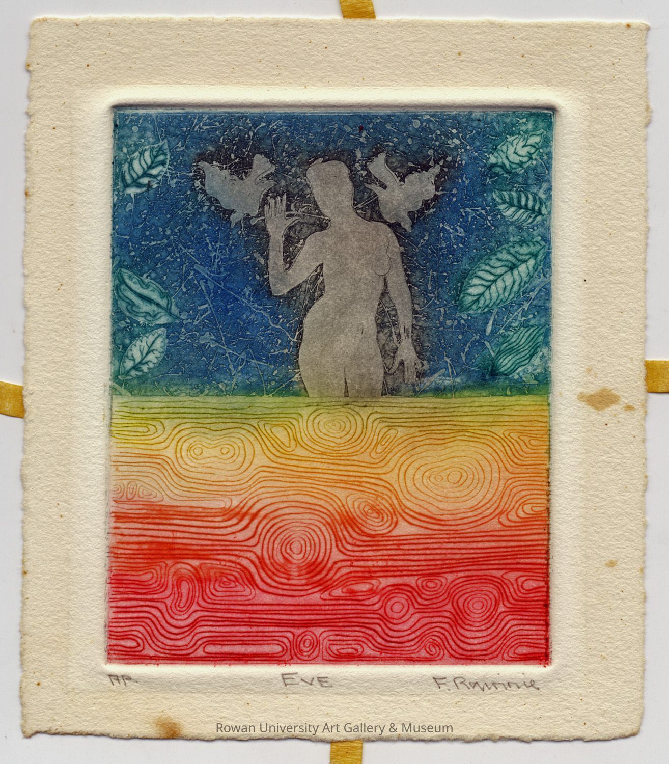 Three-quarter-length standing frontal nude female figure in silhouette with one hand raised and the other lowered, a bird on each side of her head, set against a background with prominent leaves at the sides and positioned above an abstract rendering of water; printed in red, yellow, green, and blue inksType of Print