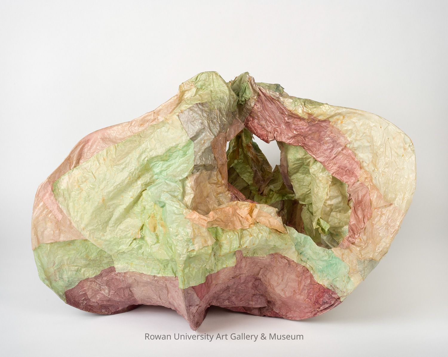 Bulbous organic form in green, orange, and red with curving projections and gathered at the topType of Sculpture
