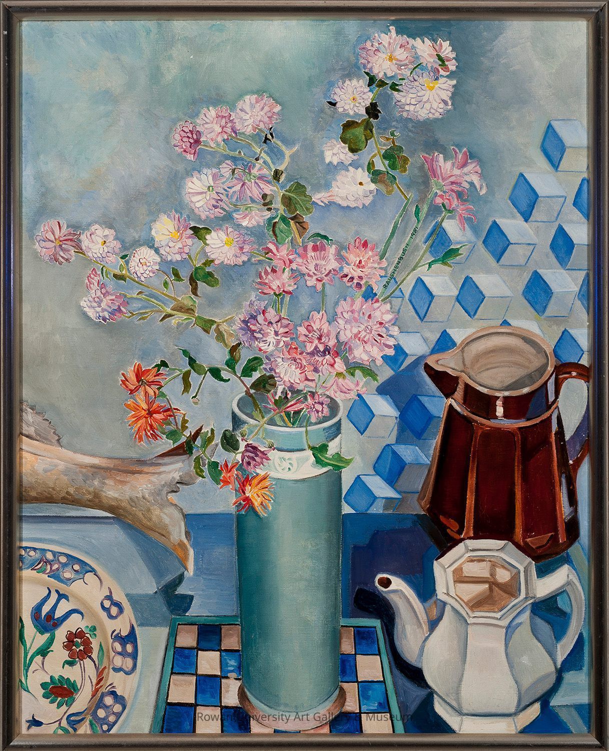 Still life with white, pink, and purple flowers in a cylindrical decorative vase on a checkerboard trivet, positioned between a fish tail and ceramic plate with floral motifs on the left, and a brown ceramic pitcher, white ceramic teapot, and floating cube forms on the rightType of Painting