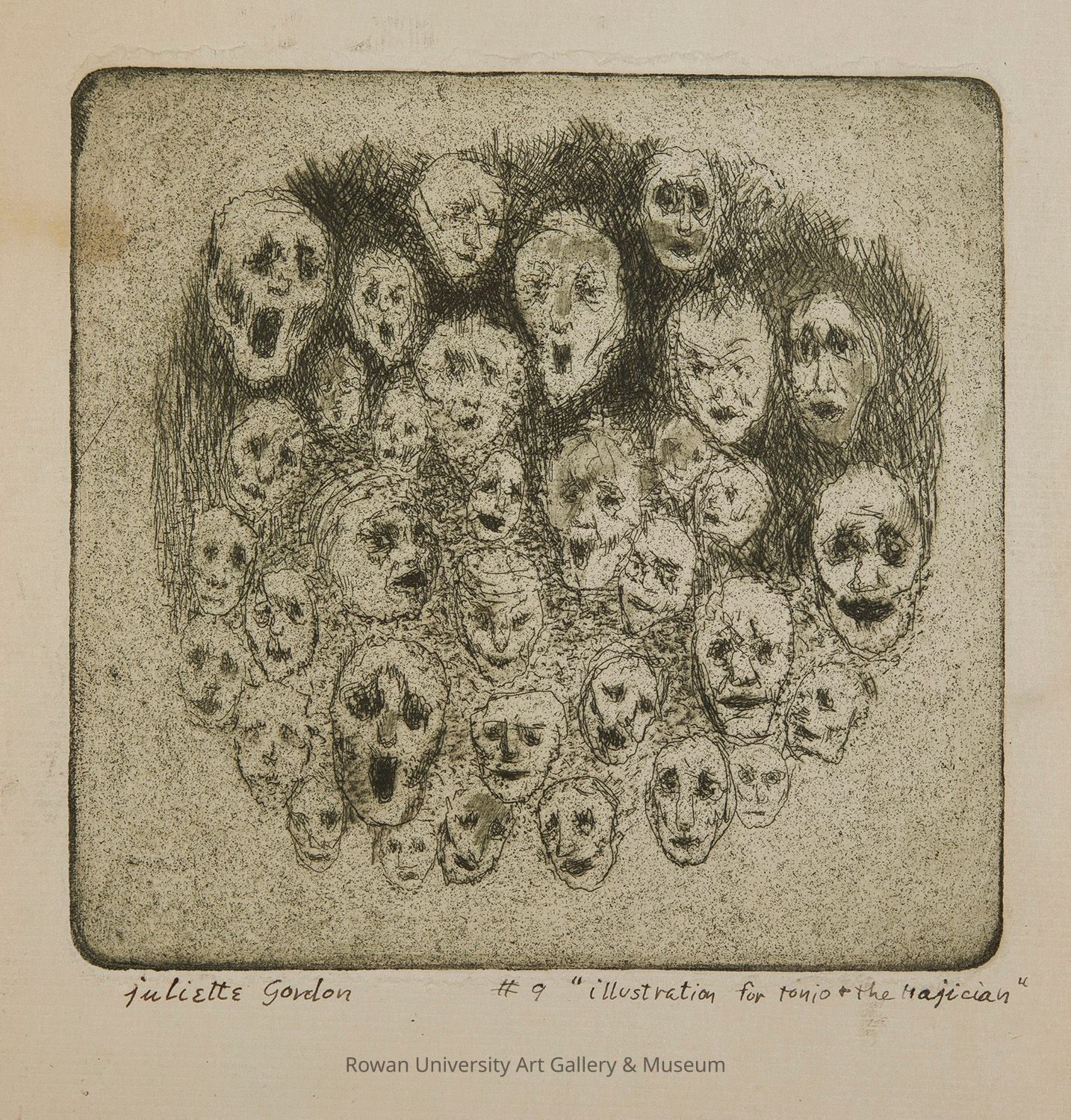 Small etching with a dark, roughly circular formation of disembodied heads, mostly frontal and varying in size, with open mouths and wide eyesType of Print