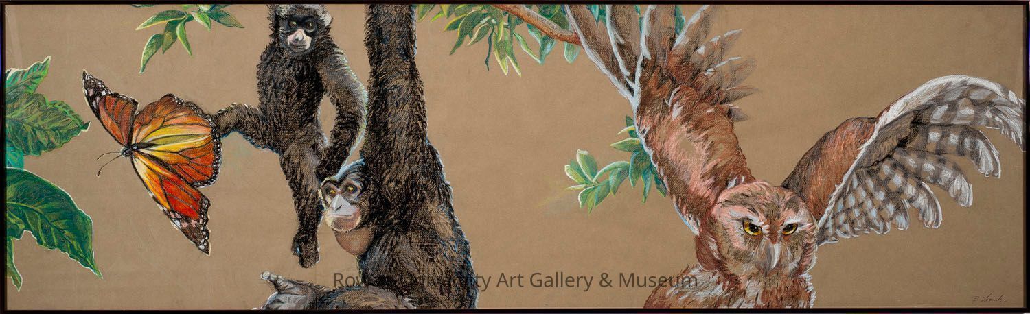 View of leaves, a butterfly, two primates hanging from a tree branch, and an owl, set against an olive-green backgroundType of Drawing