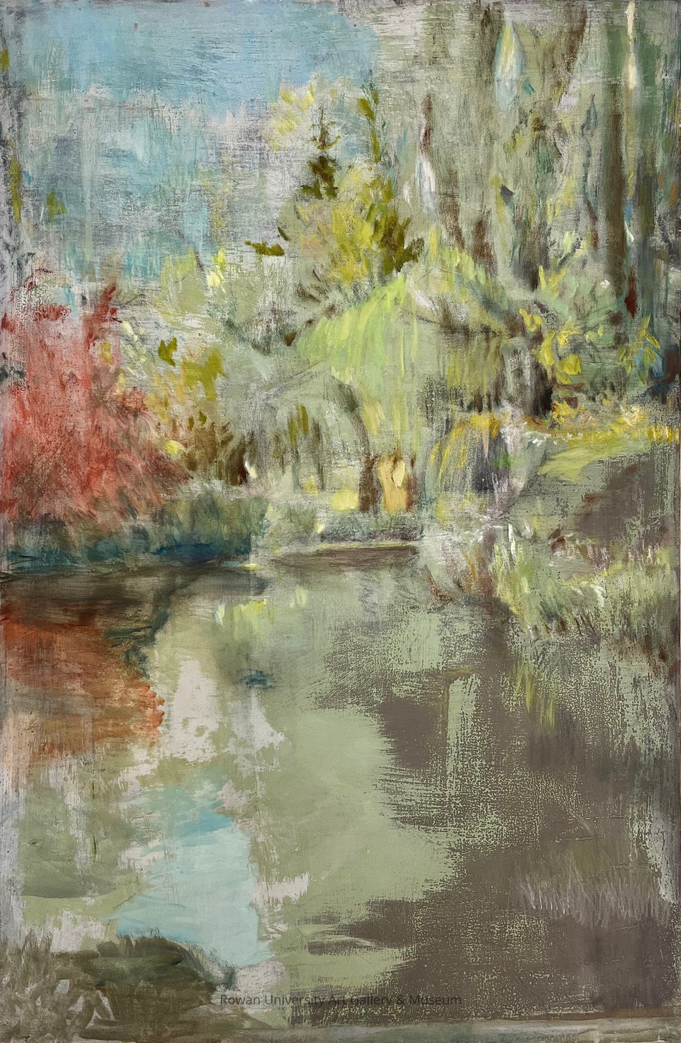 Loosely rendered painting of a landscape with trees at the upper right, a river occupying the lower half, and a glimpse of sky in the upper leftType of Painting