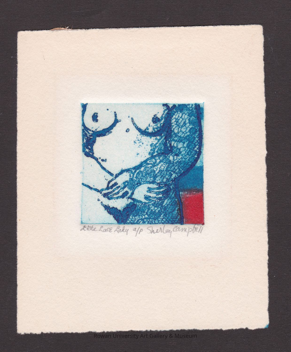 Shirley D. Campbell (1919–2009), Little Lace Lady, undated, etching and aquatint on paper, 4 11/16 x 3 7/8 in. (sheet), 1 7/8 x 1 7/8 in. (impression). Rowan University Museum of Contemporary Art, Gift of Shirley Shalit (2018.7). Photo: Andrew D. Hottle.