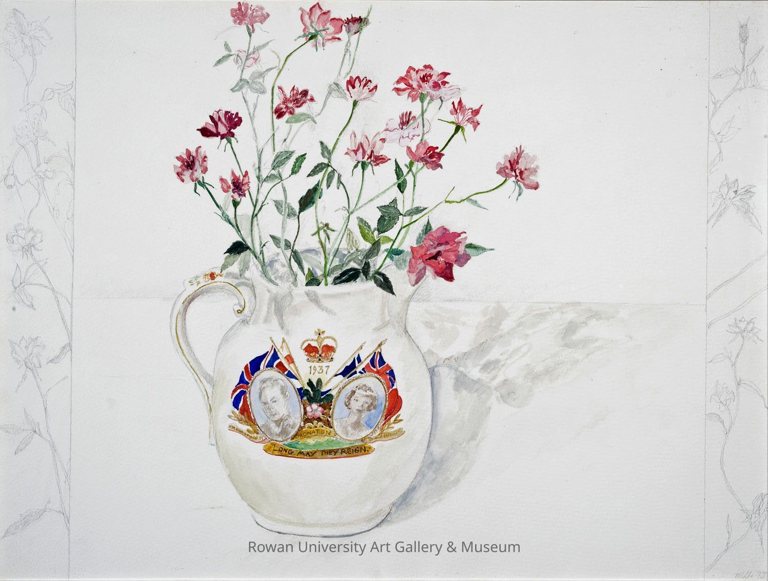 Still life of a ceramic pitcher with a curved handle, decorated with an image of two heads circumscribed by ovals with flags, a crown, and inscriptions, and containing a spray of thin-stemmed small red flowers, positioned on a tabletop and bracketed on the left and right edges by vertical bands of floral motifsType of Painting