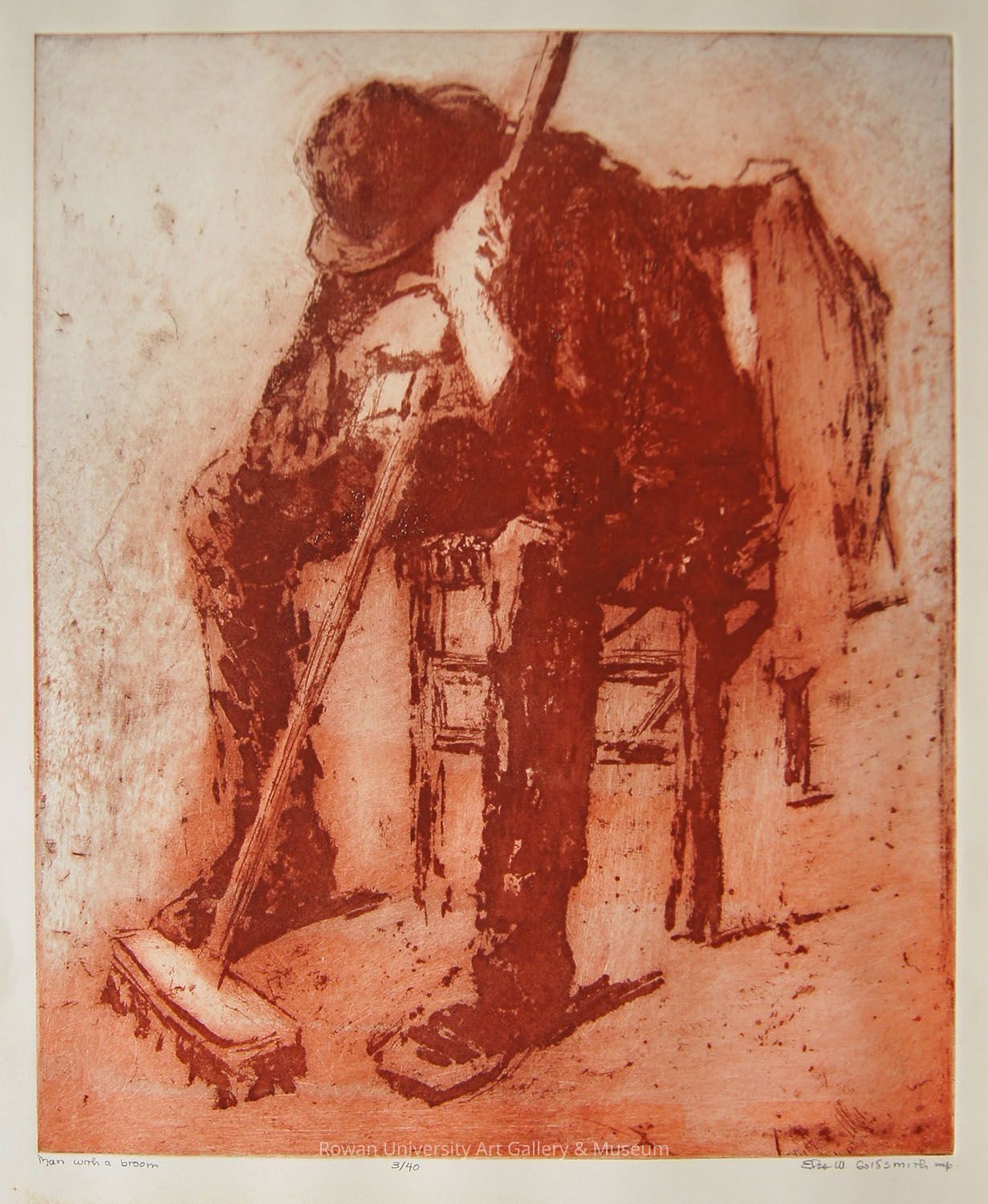 Full-length monochromatic red etching of a young man turned three-quarters to the left, dressed in a long-sleeved shirt, wide-brimmed hat, long pants, and boots, leaning forward while seated in a simple chair with his feet on the floor, elbows on his knees, head lowered, and holding a long-handled broom whose brush rests on the floor; a garment is draped over the right side of the chairType of Print