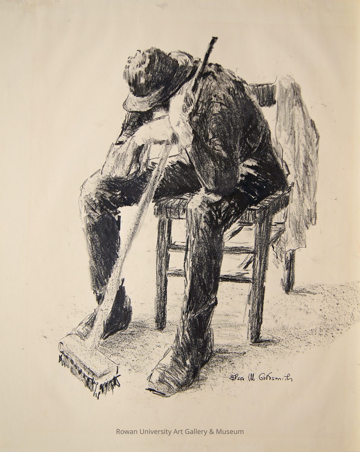 Full-length monochromatic drawing of a young man turned three-quarters to the left, dressed in a long-sleeved shirt, wide-brimmed hat, long pants, and boots, leaning forward while seated in a simple chair with his feet on the floor, elbows on his knees, head lowered, and holding a long-handled broom whose brush rests on the floor; a garment is draped over the right side of the chairType of Drawing