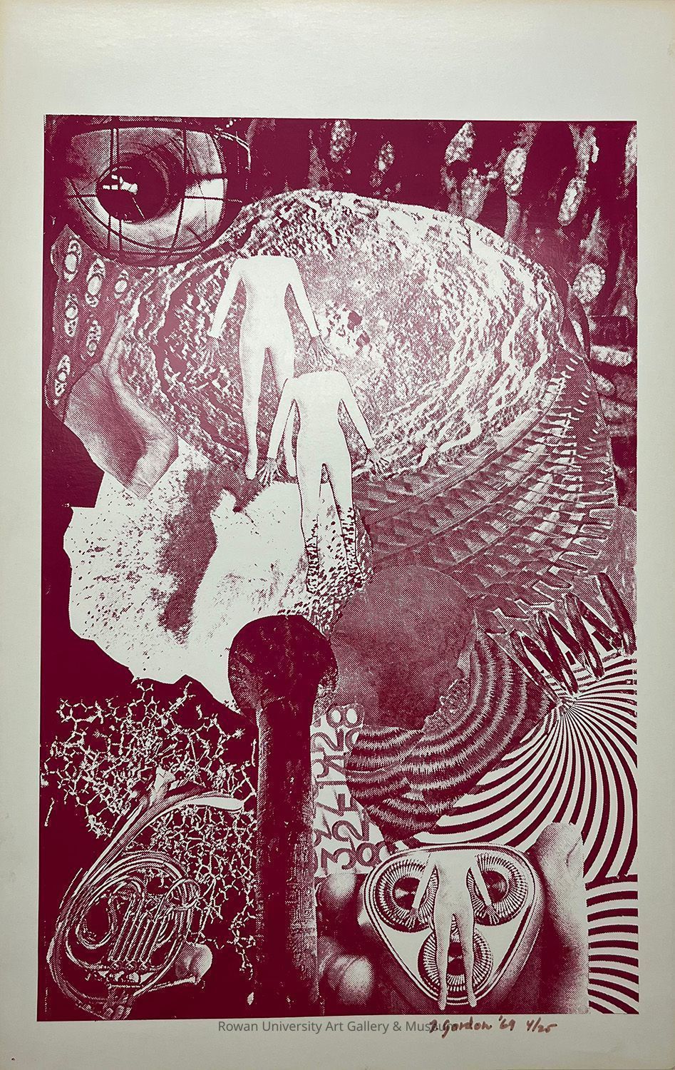 Monochromatic screenprint of a collage with various colorful magazine cutouts, including a moon crater, two headless figures, a woman's hand, a French horn, a papyrus column from an Egyptian temple, and the head of an electric razorType of Print