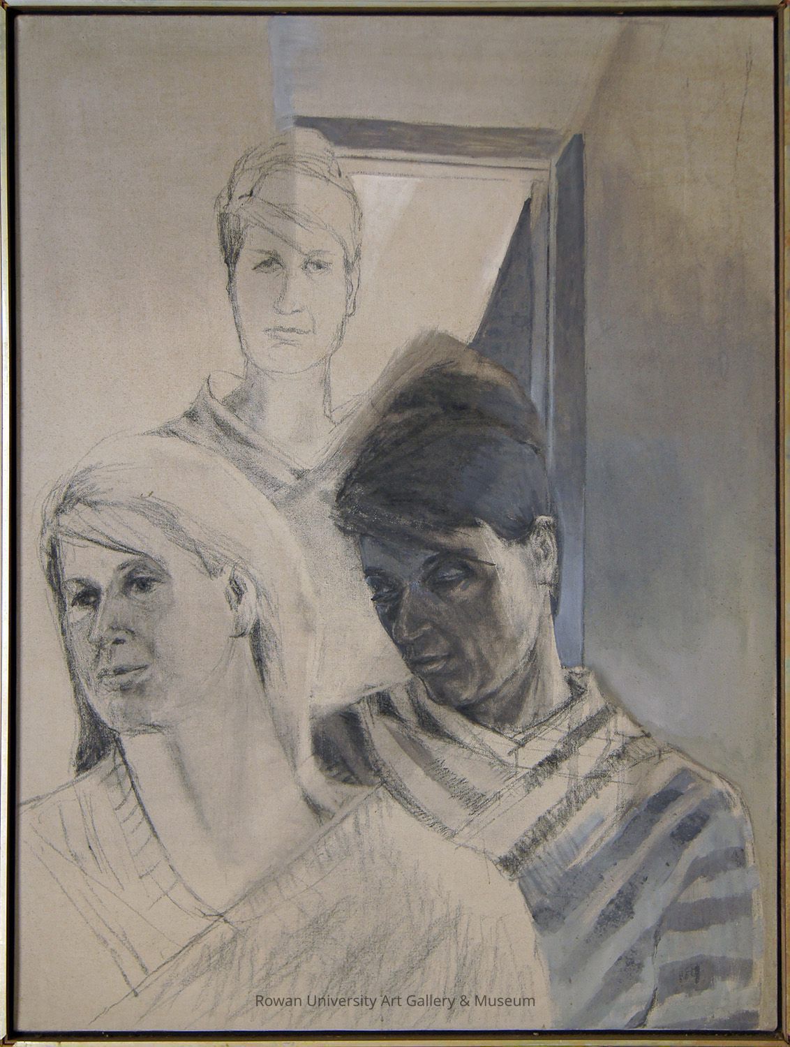 Bust-length representations of three women in an interior with a tall rectangular framed mirror behind them; the woman in the foreground is turned three-quarters, has long hair, and looks off to the side; the woman partly behind her is turned three-quarters, her hair up, and looks down; the woman behind them is fully frontal, has her hair up, and looks directly at the viewerType of Painting