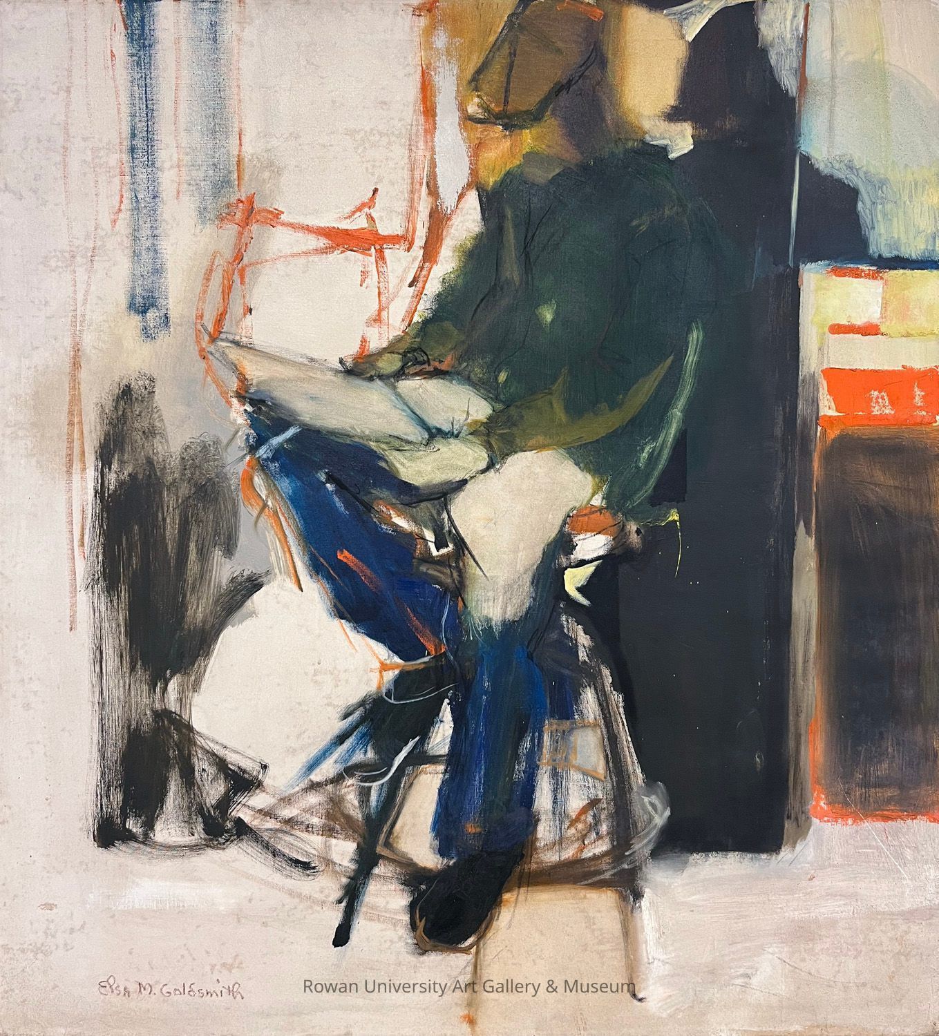 Loosely rendered representation of a man in a flat cap, brownish-green jacket, and blue pants, seated on a stool and looking down at an open book; behind him is the shadow of his head an torso, along with abstract shapes and vertical lines to suggest an interior spaceArtwork Details