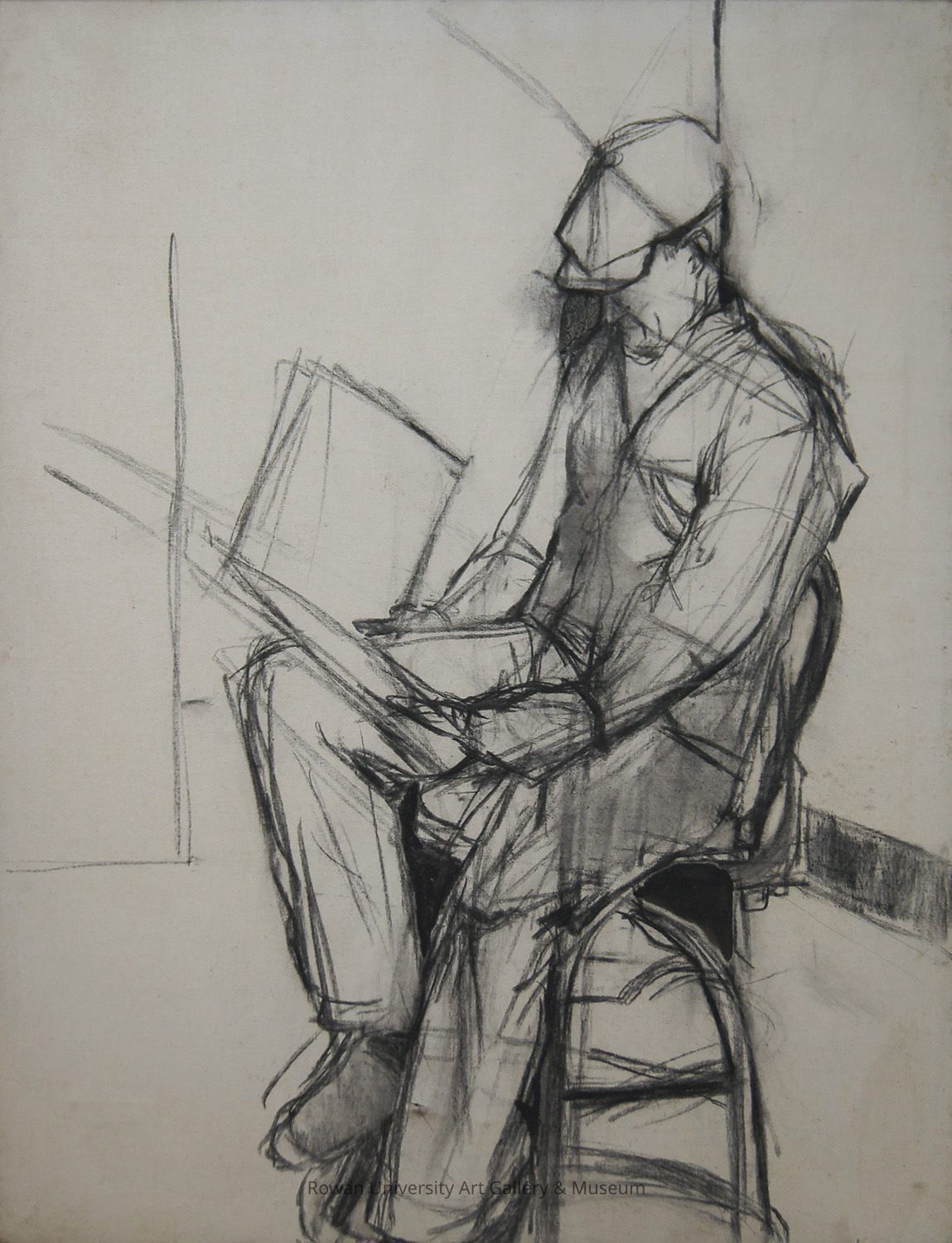 Loosely rendered representation of a man in a flat cap, jacket, and pants, seated on a stool and looking down at an open book; behind him are vertical, horizontal, and diagonal lines to suggest an interior spaceType of Painting