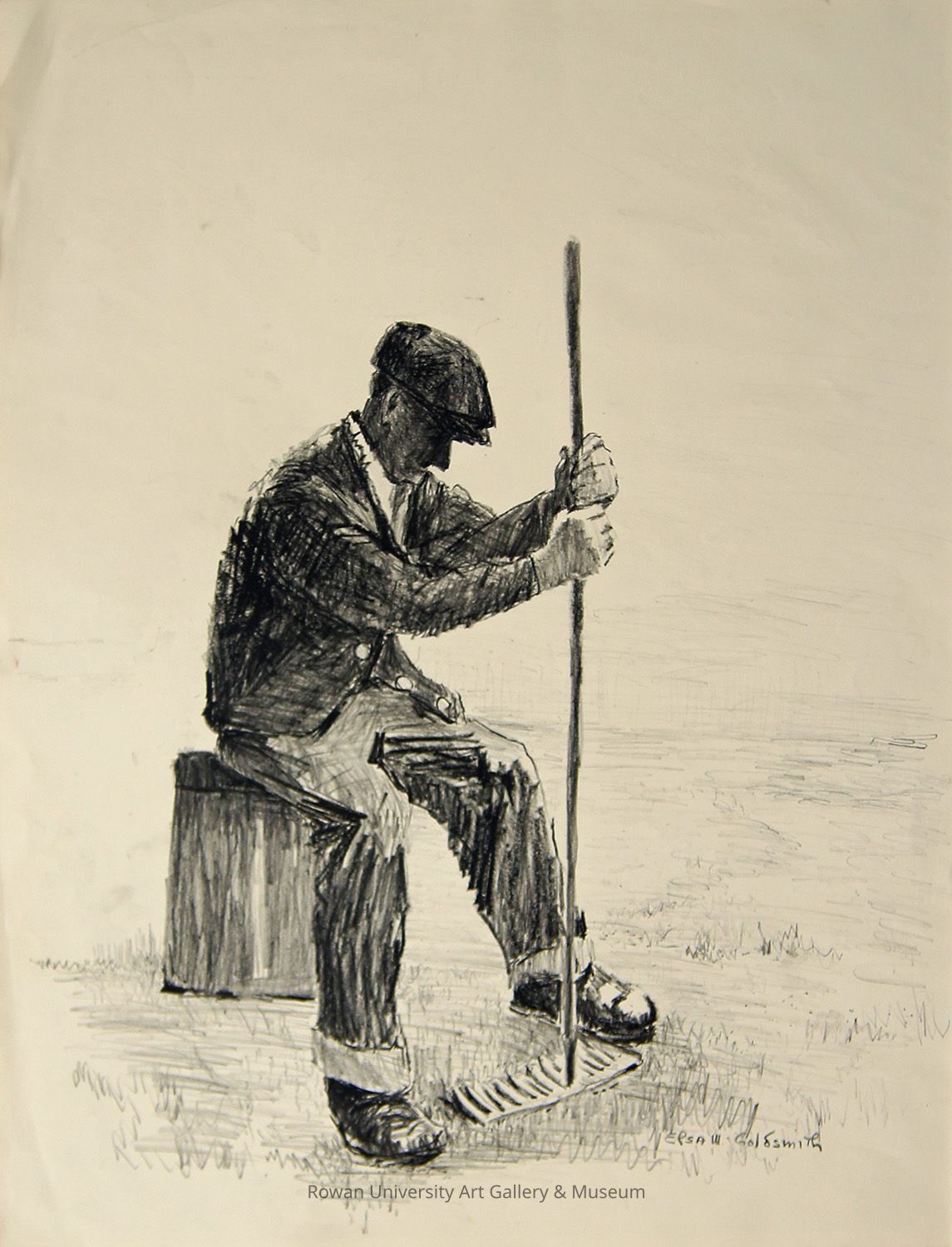 Full-length monochromatic drawing of a mature man turned three-quarters to the right, dressed in a dark long-sleeved jacket, flat cap, trousers with rolled cuffs, and boots, leaning forward while seated on a block of wood with his hands grasping a rake; sparse suggestions of grass define the terrain against the empty backgroundType of Drawing