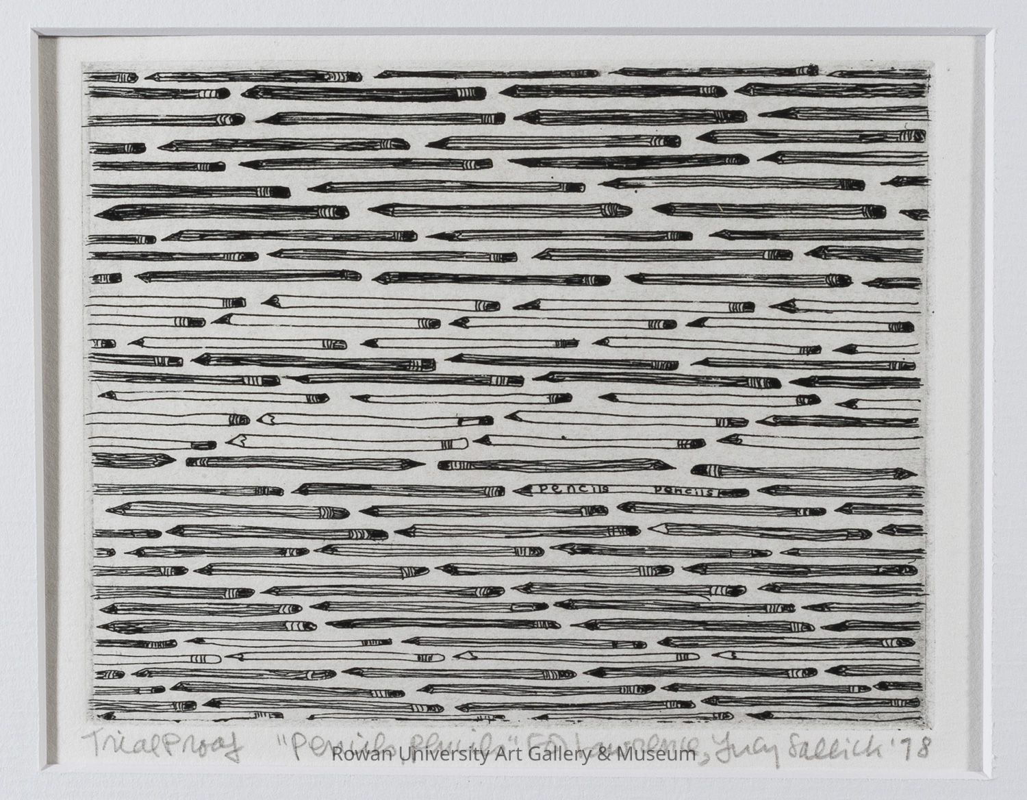 Lucy Sallick (b. 1937), Pencils, Pencils, 1978, lithograph on paper, trial proof, 3 7/8 x 4 7/8 in. (impression), 11 7/8 x 15 in (sheet). Rowan University Museum of Contemporary Art, Sylvia Sleigh Collection (2011.95). Photo: Karen Mauch Photography.