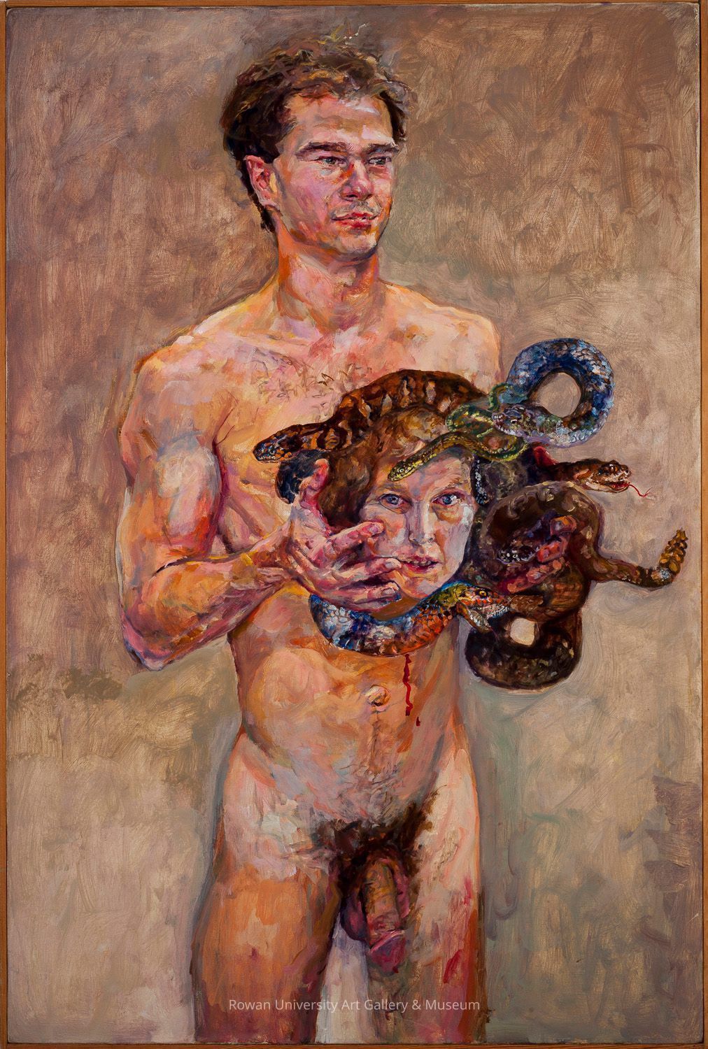 Three-quarter length standing nude man looking toward his left and holding the head of a woman whose hair contains five snakes, set against a loosely rendered neutral backgroundType of Painting