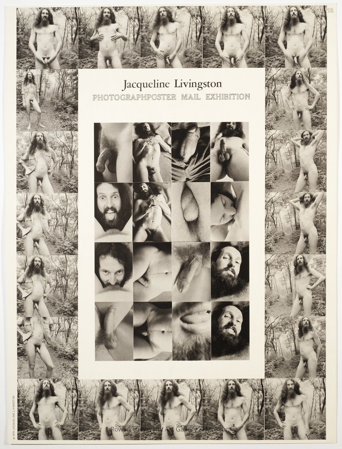 Group of thirty-six photographic images printed on a single poster, arranged as four rows of four in the center and twenty forming a perimeter; the center images show fragmentary and close views of a nude man; the perimeter images show a nude man in a landscape striking various posesType of Print