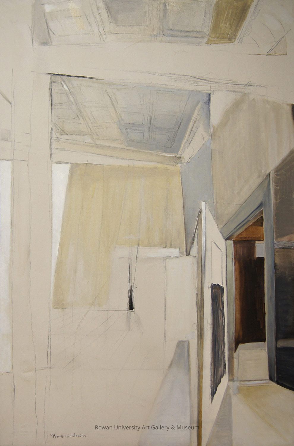 Abstract rendering of an interior composed mostly of off-white and gray geometric shapes divided by dark outlines; an open door at the lower right reveals a glimpse of another room composed of mostly brown geometric shapesType of Painting