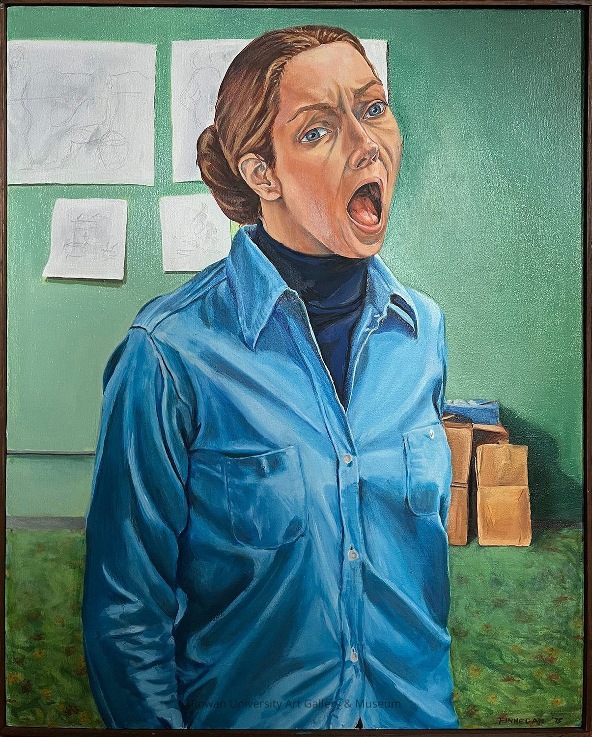 Half-length figure of a woman with blue-gray eyes, brown hair pulled into a bun, furrowed brow, and mouth wide open, who turns toward the right and wears a blue long-sleeve shirt over a dark blue turtleneck; behind her is a green wall hung with drawings and a small cluster of boxes atop a horizontal green surface flecked with orange and brownType of Painting