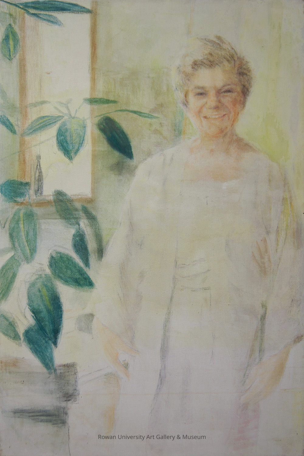 Painting of a woman with short brownish-blonde hair, facing forward, wearing a long white dress, and standing with her arms at her sides against a vaguely rendered wall; on the left is a window or mirror behind the leaves of a tall potted plant