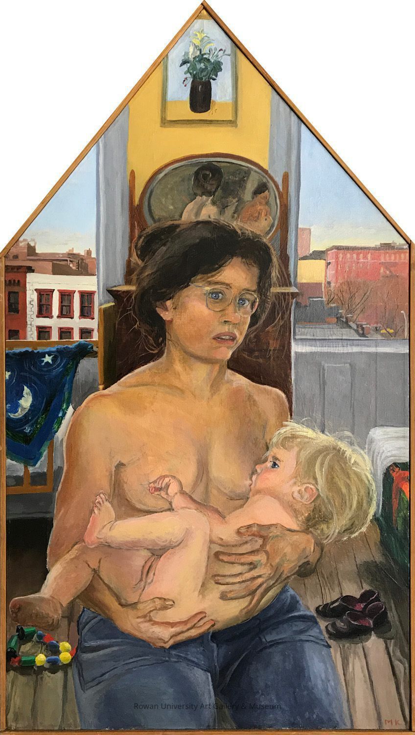 Three-quarter-length woman, shirtless and wearing blue jeans, seated on a high-back chair and holding her nude infant daughter with both arms; in the background are city views on either side of a wall with an oval mirror below a still life of flowers; on the left is a crib with a blanket; on the floor are shoes and rattle; based on a painting by Ambrogio LorenzettiType of Painting