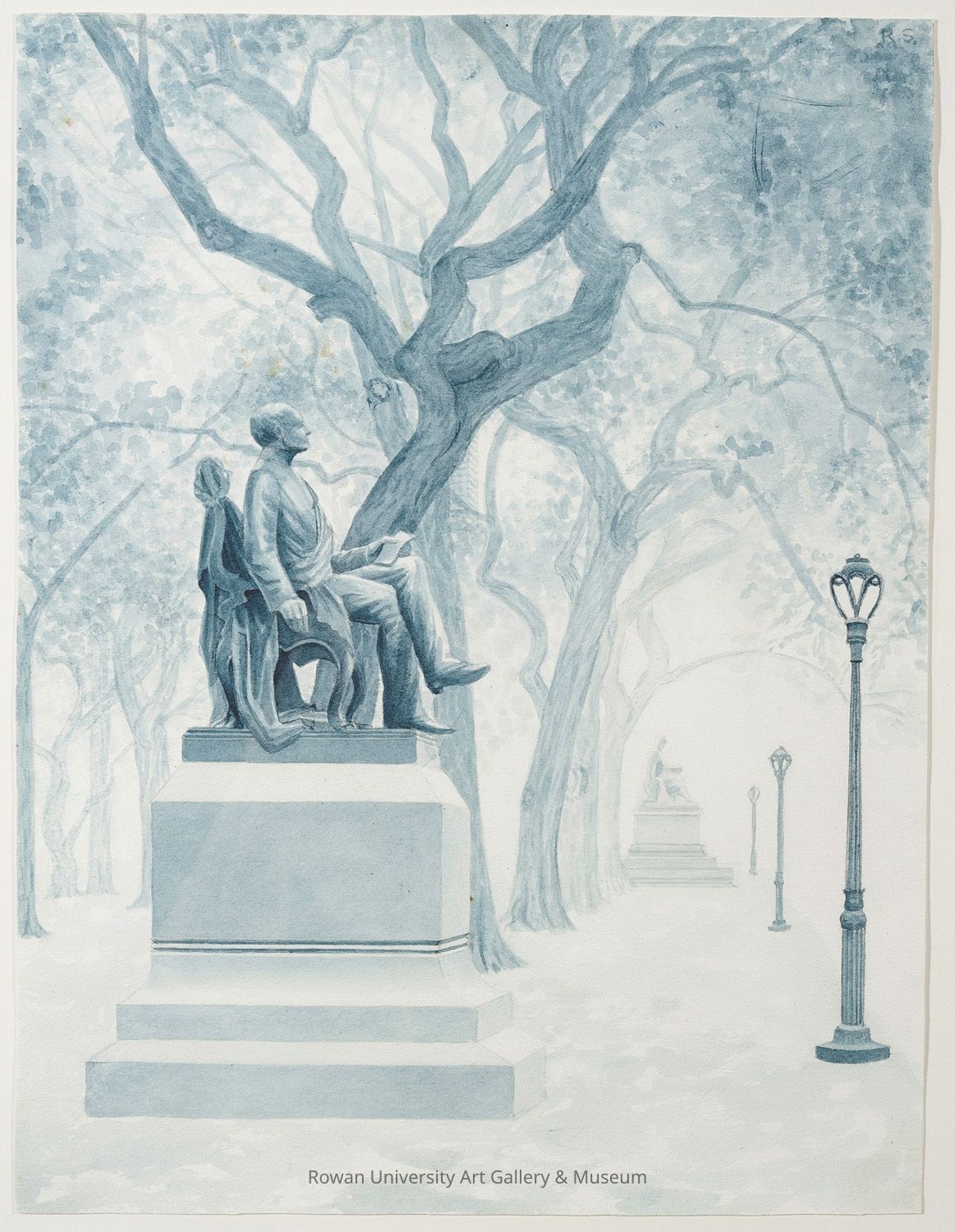 View of a sculpture of a seated man on a pedestal, in profile, with trees, streetlamps, and another sculpture on a pedestal in the backgroundType of Painting