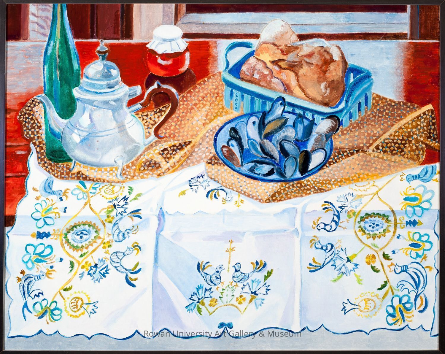 Still life of a wooden table, viewed from the front and from slightly above, partially covered by white fabric with blue and gold embroidery, on which rest another piece of patterned brown fabric, a green bottle, a silver teapot, a blue basket of bread, and a blue plate of mussels; behind is a red and white jar on the table, set against a glimpse of paneling and a window frameType of Painting