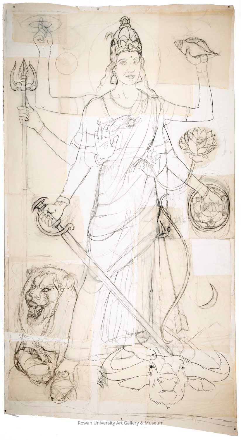 Line drawing of a full-length frontal standing figure of a woman with a crown, flowing hair, full-length garment, and eight arms, standing atop the head of a buffalo beside a recumbent lion, with a mountain in the background; pieced together from numerous smaller studies of individual sectionsType of Drawing