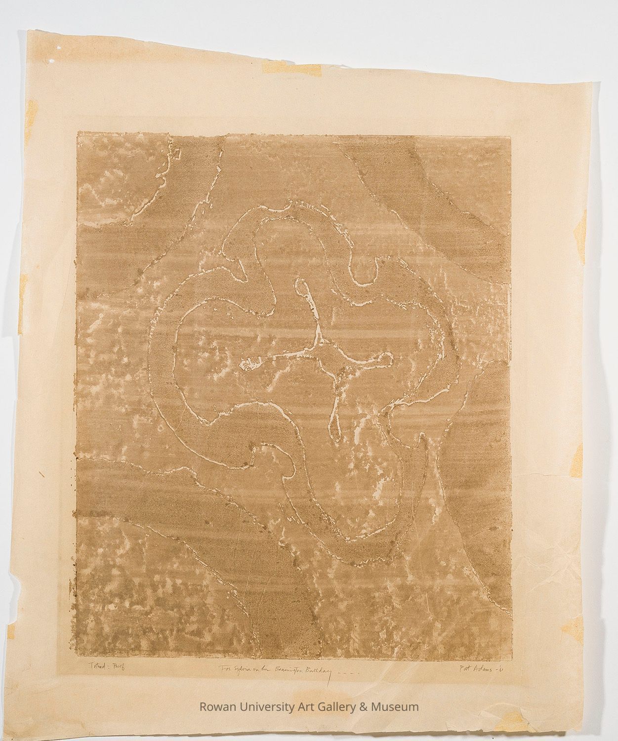 Rectangular abstraction with a central quatrefoil motif, surround by arcing forms near the cornersType of Print