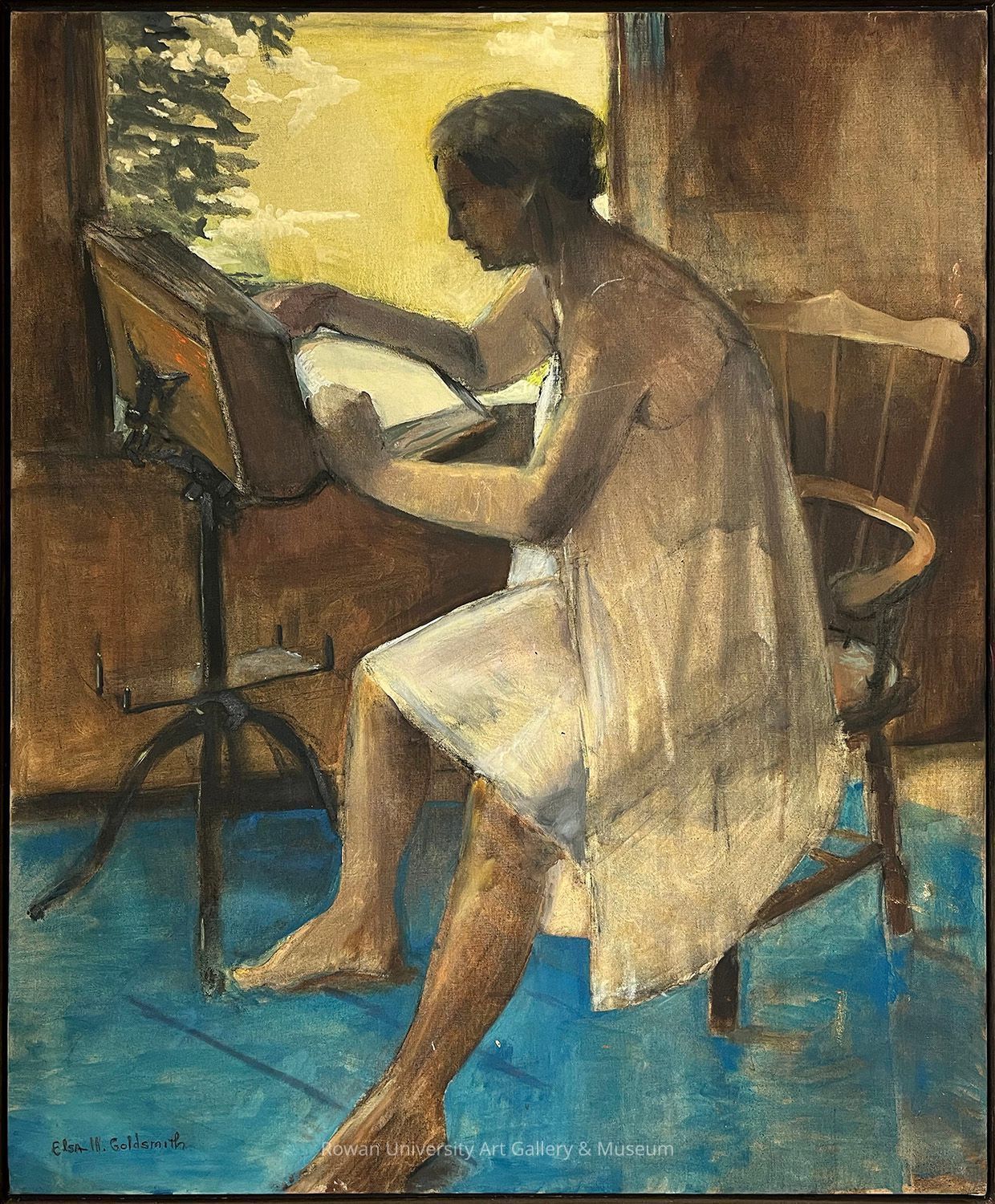 Full-length profile figure of a seated woman with short dark hair and wearing a sheer, knee-length garment; her hands rest on the pages of a large open book, which is supported by an elaborate stand; on the floor is a blue rug; behind her, a window opens to a yellow sky with glimpses of clouds and a treeType of Painting