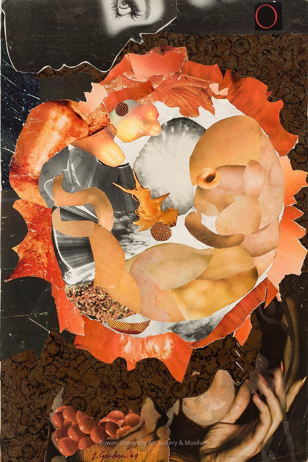 Collage consisting mostly of magazine cutouts in brown, orange, and gray; at the upper left is a woman's profile face with highlighted eye; at the center, collaged elements form a fetus in the womb; at the lower right is a woman's hand with long fingernailsDimensions