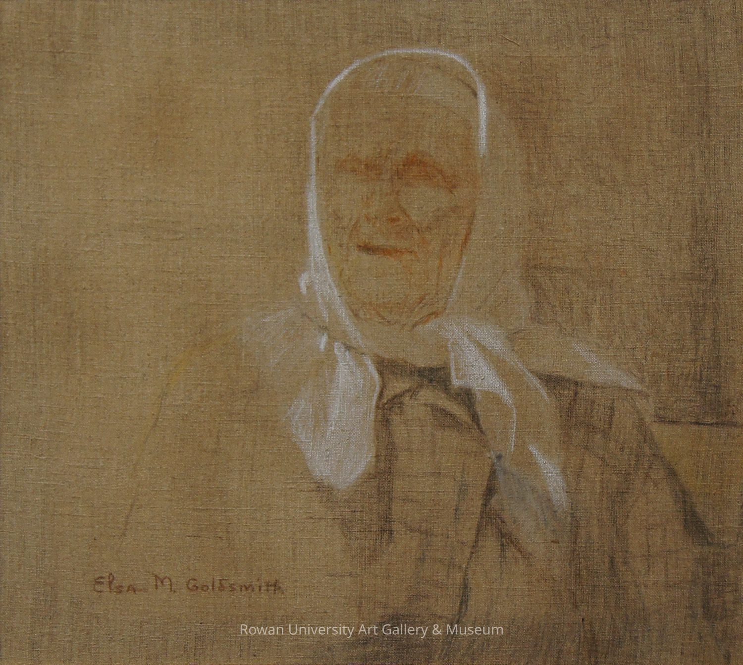 Bust-length figure of an elderly woman wearing a kerchief, emerging from an indistinct background and loosely rendered in dark gray, sanguine, and white Conté crayonType of Drawing