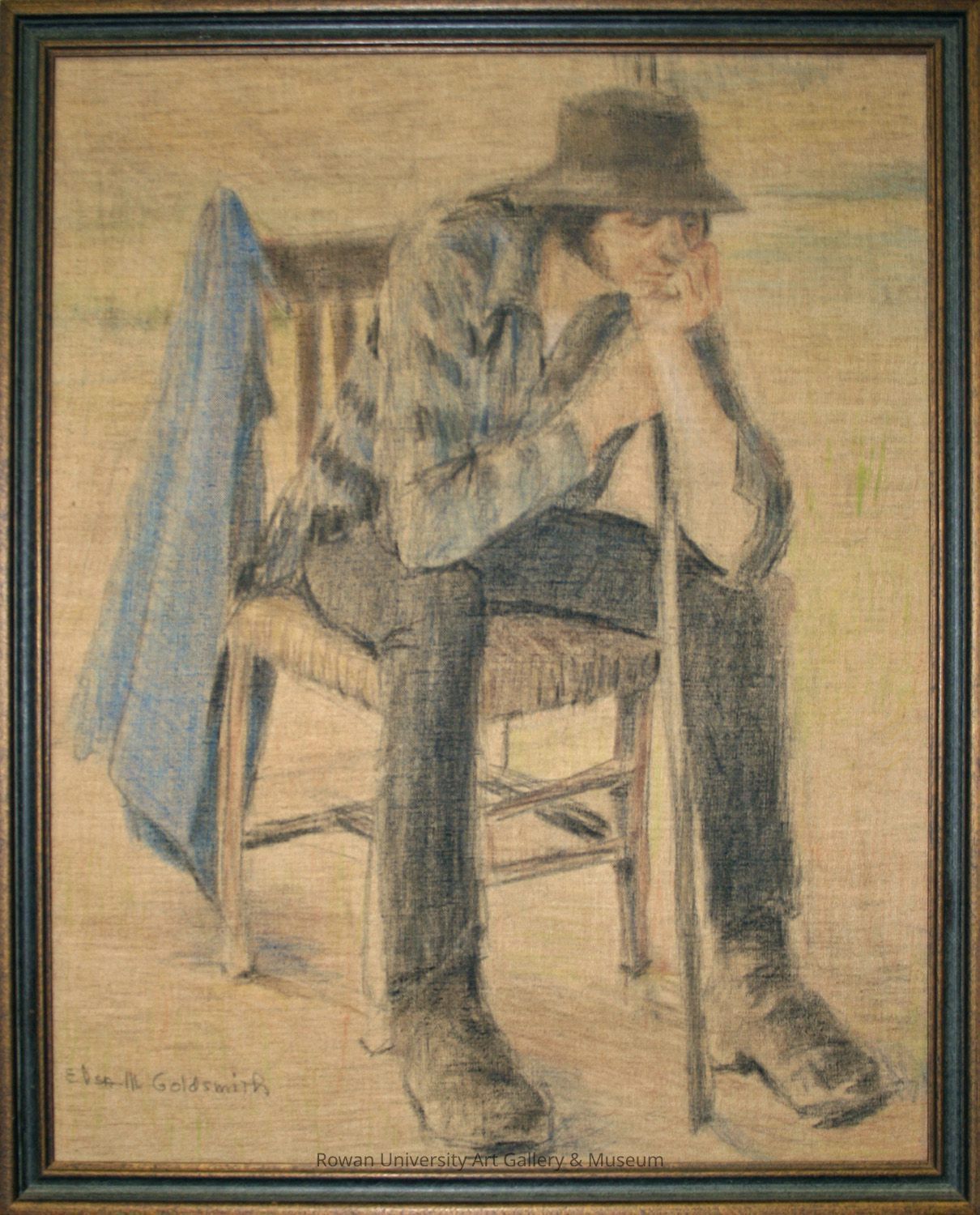 Full-length drawing of a young man turned three-quarters to the right, dressed in a gray-and-blue striped shirt, wide-brimmed brown hat, gray pants, and brown shoes, leaning forward while seated in a simple spindle-back chair with his feet on the floor, elbows on his knees, chin resting on his left hand, and holding a pole vertically in his right hand; a blue garment is draped over the left side of the chairType of Painting