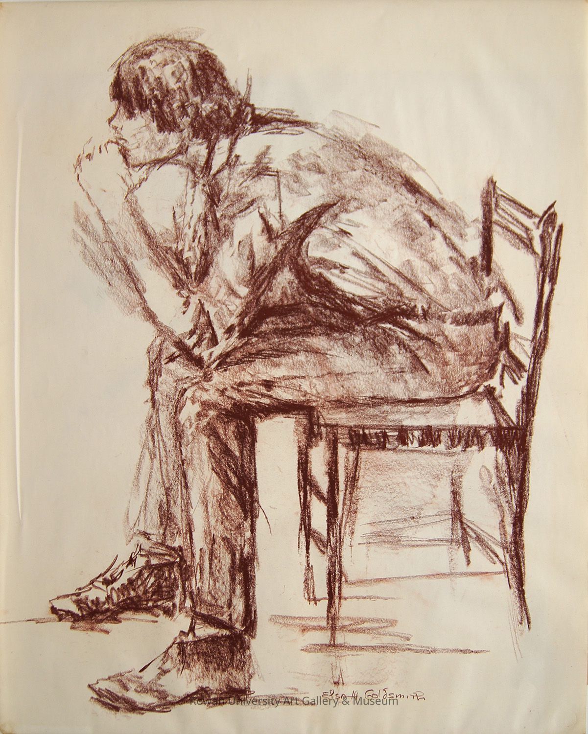 Monochromatic full-length drawing of a young man in profile, leaning forward while seated in a ladder-back chair with his feet on the floor, elbows on his knees, and chin resting in his hands; the floor is minimally suggested and the background is emptyType of Drawing