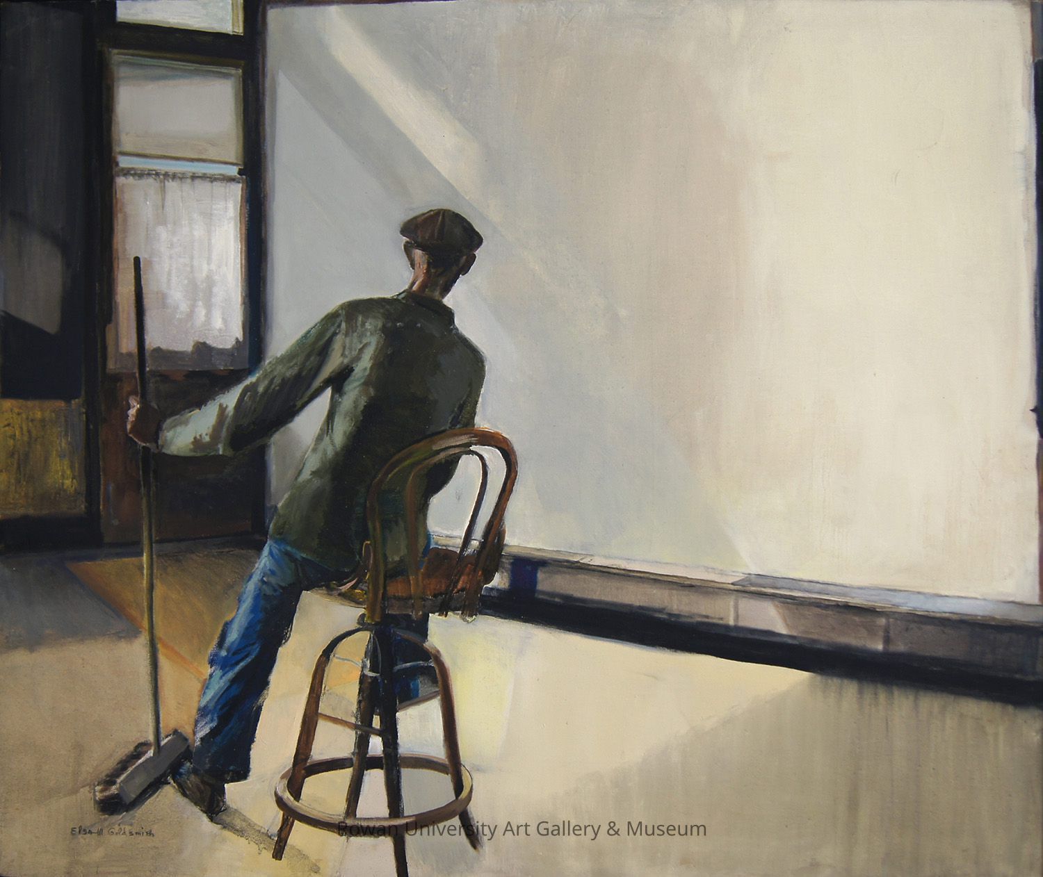 View of a man in a flat cap, jacket, and pants, seated on a stool with his back to the viewer and holding a janitorial broom; he is seated in a room with a door and window at the far left, with the remaining space occupied by an expanse of wall and floorType of Painting
