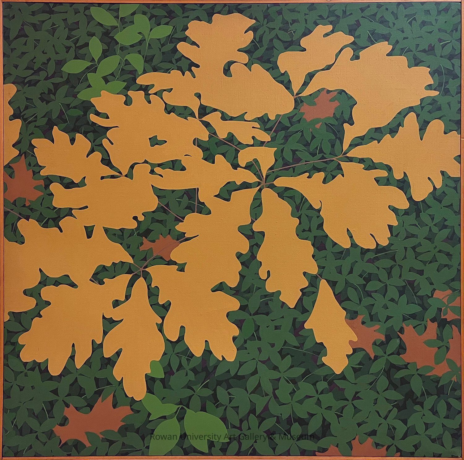 Close view of a yellow-brown leafy tree sprout, set against a dense network of green plants interspersed with brown leavesType of Painting