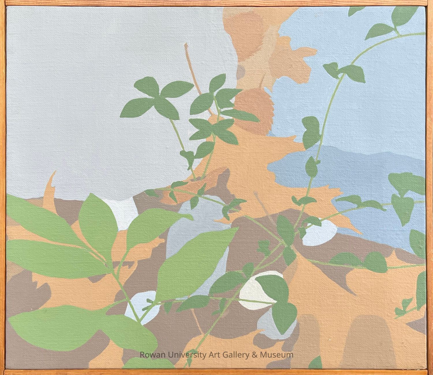 Close truncated view of two large rocks, six smaller stones, dry leaves, and three leafy green plantsType of Painting
