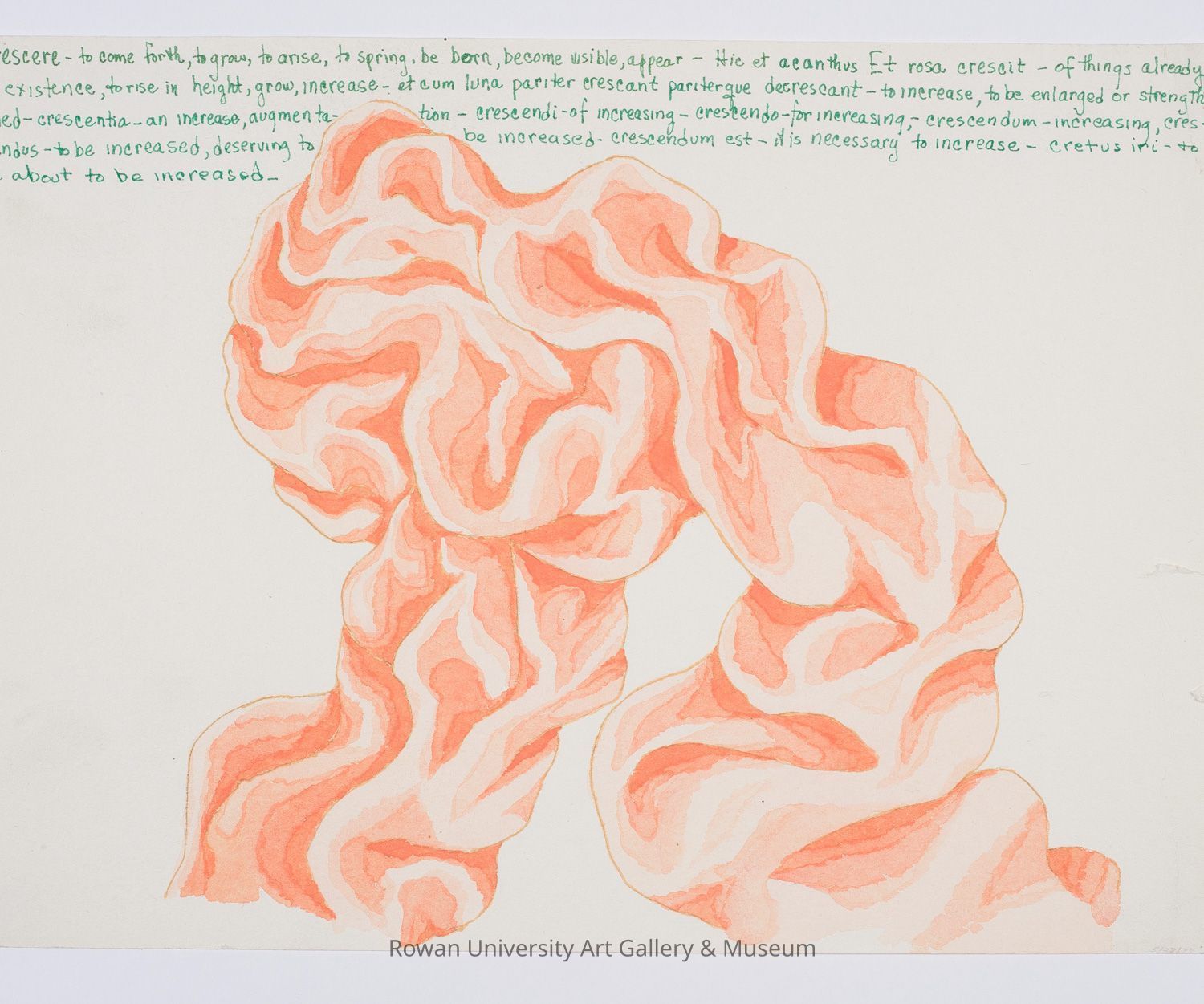 Abstract twisted and undulating orange form, set against a black background with a lengthy green inscription along the top of the sheetType of Painting