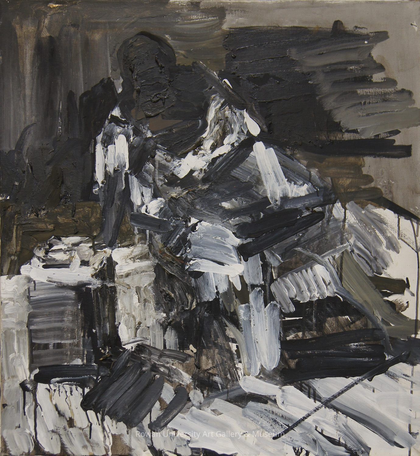 Full-length clothed figure rendered in loose strokes of black, brown, and white, seated in a studio environment defined by loose strokes of black, brown, and whiteType of Painting