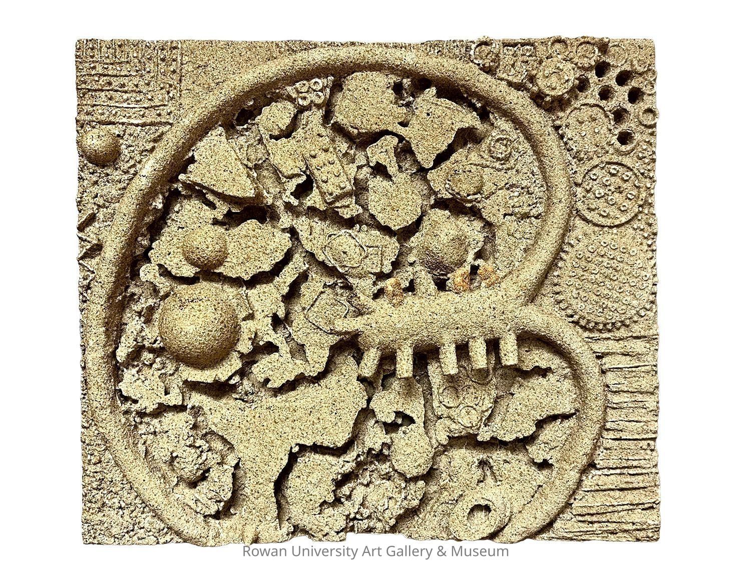 Horizontal rectangular relief sculpture consisting of a variety of ambiguous linear, geometric, and organic shapes and forms with a dominant raised leaf-like form occupying the centerType of Sculpture