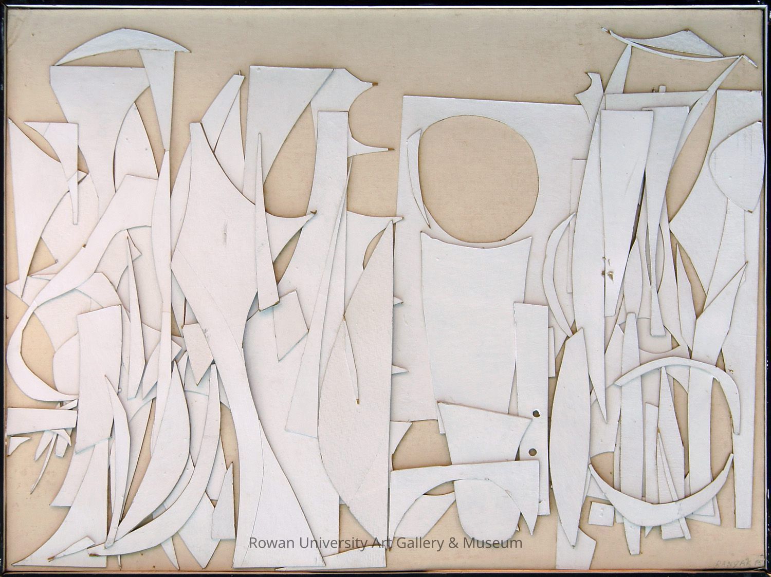 Abstract composition of layered cutout white shapes, most oriented vertically, affixed to a tan backing to form a low-relief collageArtwork Details