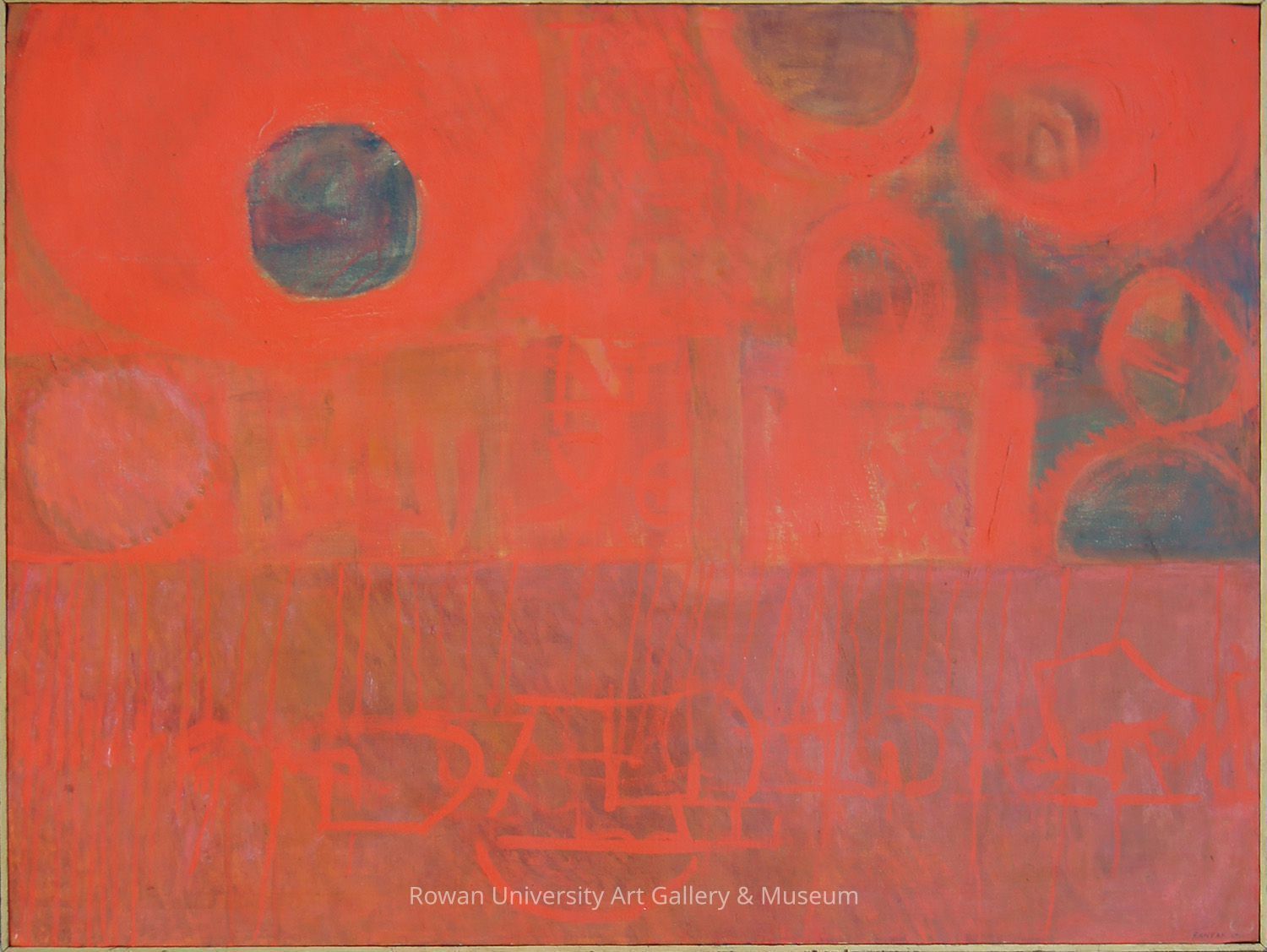 Predominantly red abstract composition divided horizontally into two smaller rectangles; in the upper rectangle are mostly circular forms in red and blue-gray; in the lower rectangle are linear forms that suggest writingType of Painting
