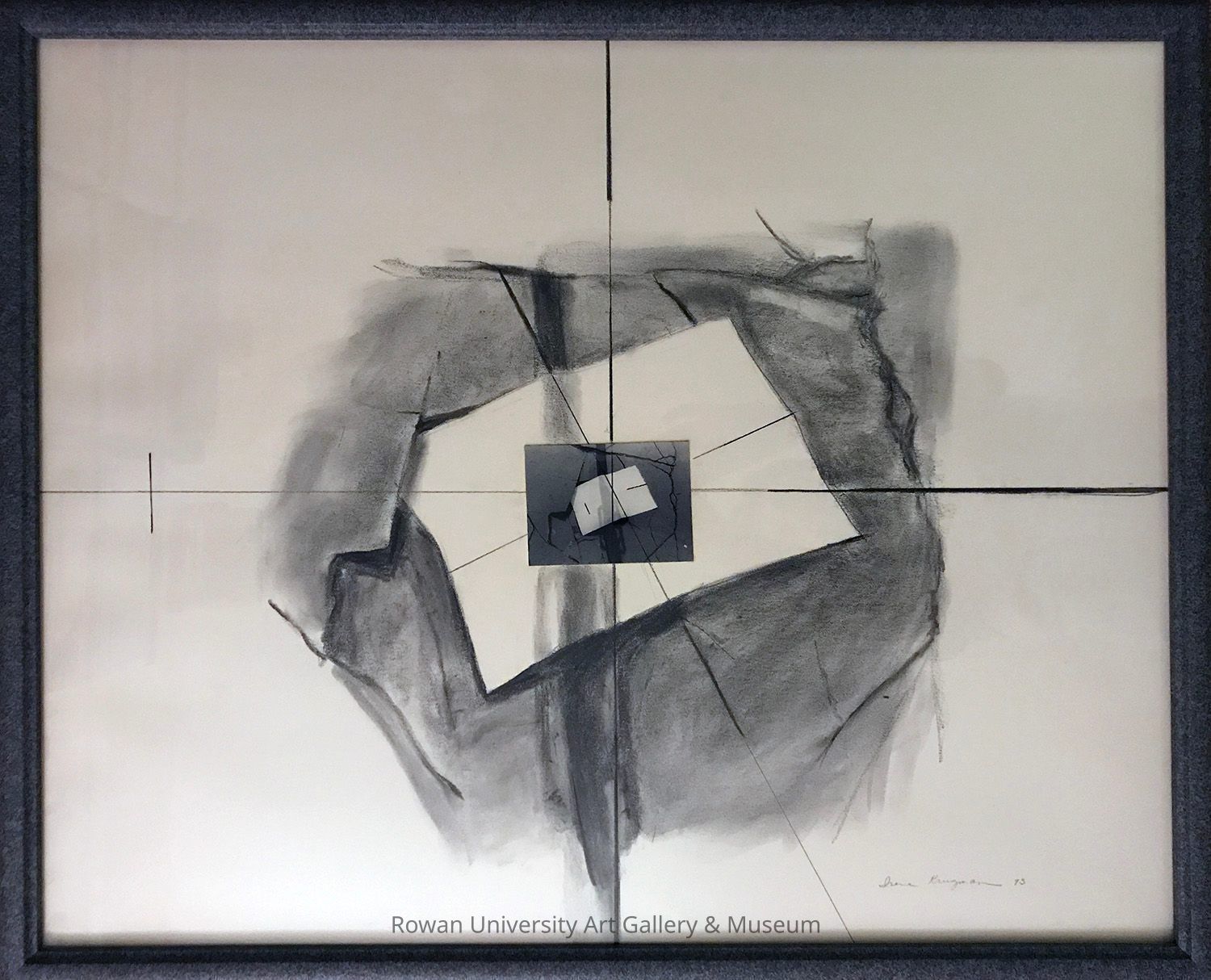 Monochromatic drawing, subdivided into four quadrants by thin black lines, containing a centralized rendering of a rectangular sheet of paper on a cracked asphalt surface; over the drawing and located at the intersection of the quadrants is a small photograph of a rectangular sheet of paper on a cracked asphalt surfaceType of Drawing