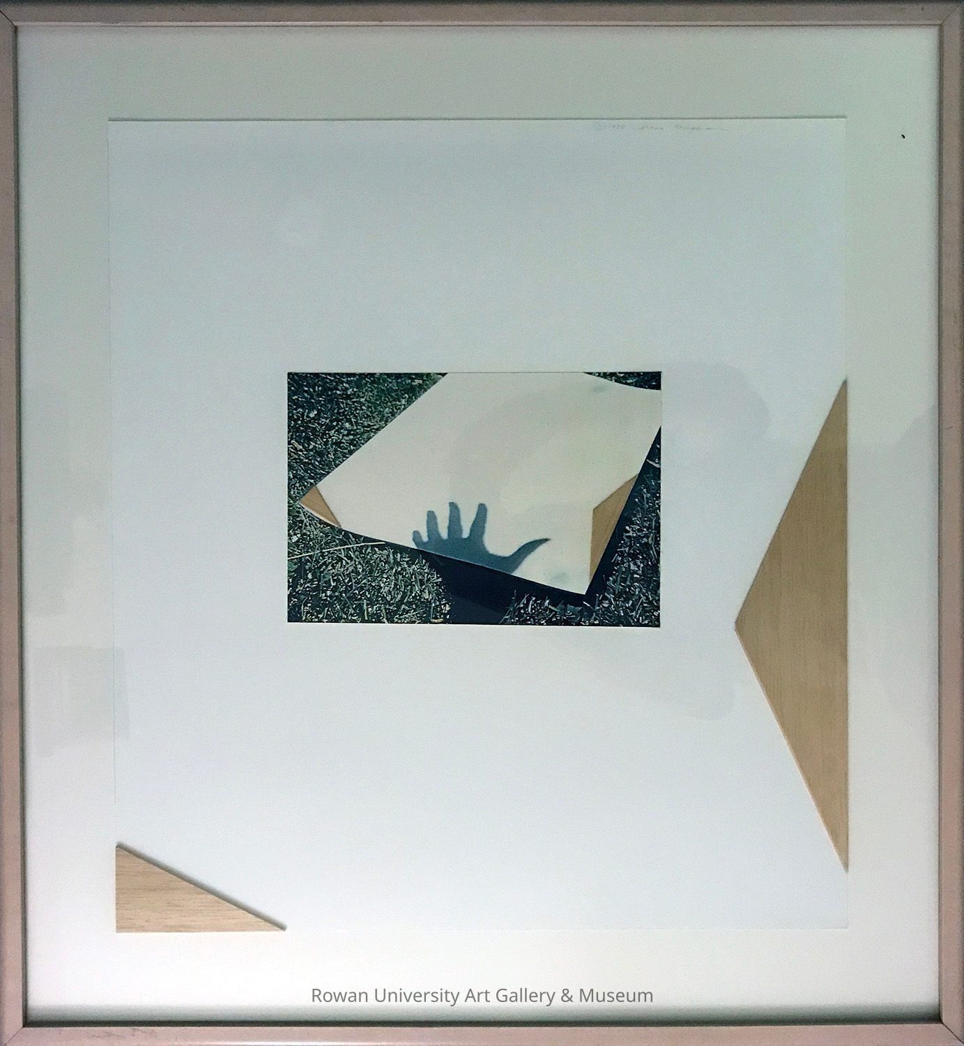 Mixed media composition consisting of a large sheet of paper with triangular pieces of wood collaged at the lower left and middle right; near the center is a color photograph showing the large sheet of paper resting in a grassy landscape and party covered by the cast shadow of a handDimensions