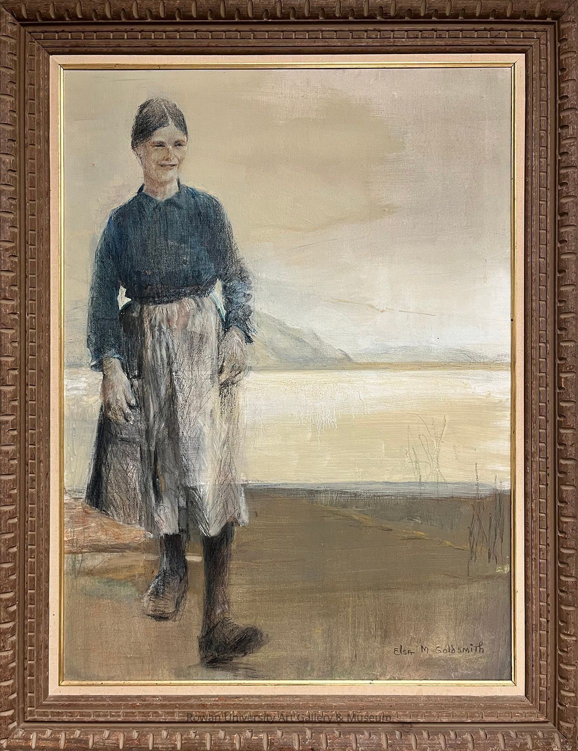 Mixed-media painting, rendered mostly in muted tones of white and light brown, depicting a full-length, frontal woman at the left with a simplified landscape, distant hills, and sky occupying the right half of the composition and filling the background behind the woman; her head is turned toward the right as she smiles slightly and strides forward; her hair is short, parted in the middle, and pinned up; she wears a dark long-sleeved shirt, off-white knee-length skirt, stockings, and brown shoesType of Painting