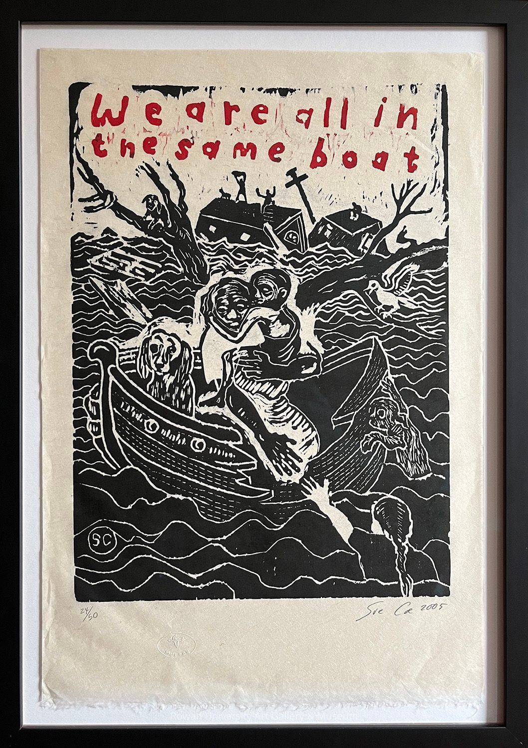 Black and white scene dominated by water, defined by repeated undulating lines, with a boat in the foreground carrying a dog and an adult human who holds a child; reaching toward the person in the boat is another human in the water while an animal clings to the outside of the boat; in the middle ground are trees, one with a bird and another with a dog; in the background are a utility pole and flooded houses with three people and a dog on the roofs; at the top, written in red, is the phrase "We are all in the same boat"Type of Print