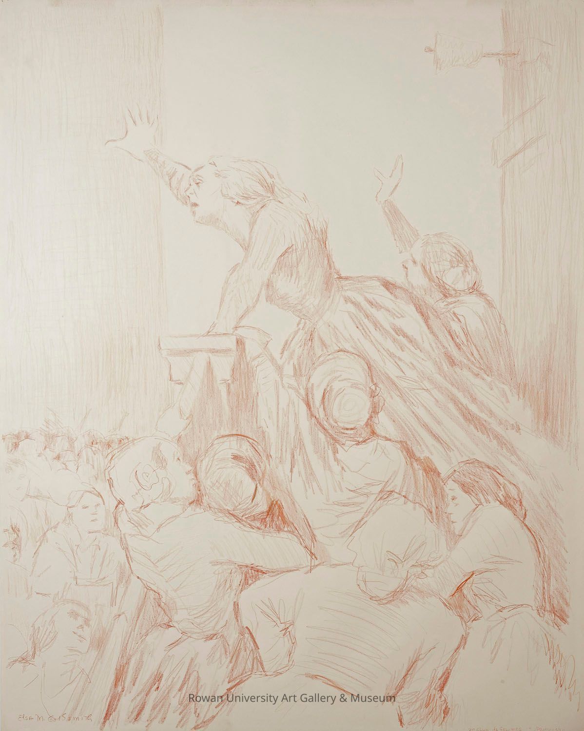 Elsa M. Goldsmith (1920–2005), after Honoré Daumier (1808–1879), French Women, from Women on the March Series, 1976–77, Conté crayon on paper, 29 x 23 in. Rowan University Museum of Contemporary Art, Gift of Cris and Jo Ann Goldsmith (2021.66.9). Photo: Karen Mauch Photography.