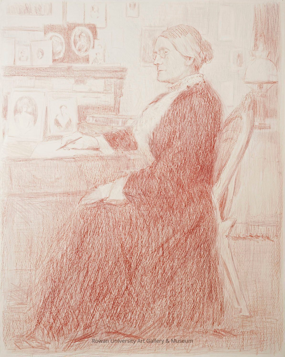 Elsa M. Goldsmith (1920–2005), Susan B. Anthony, from Women on the March Series, 1976–77, Conté crayon on paper, 29 x 23 in. Rowan University Museum of Contemporary Art, Gift of Cris and Jo Ann Goldsmith (2021.66.5). Photo: Karen Mauch Photography.