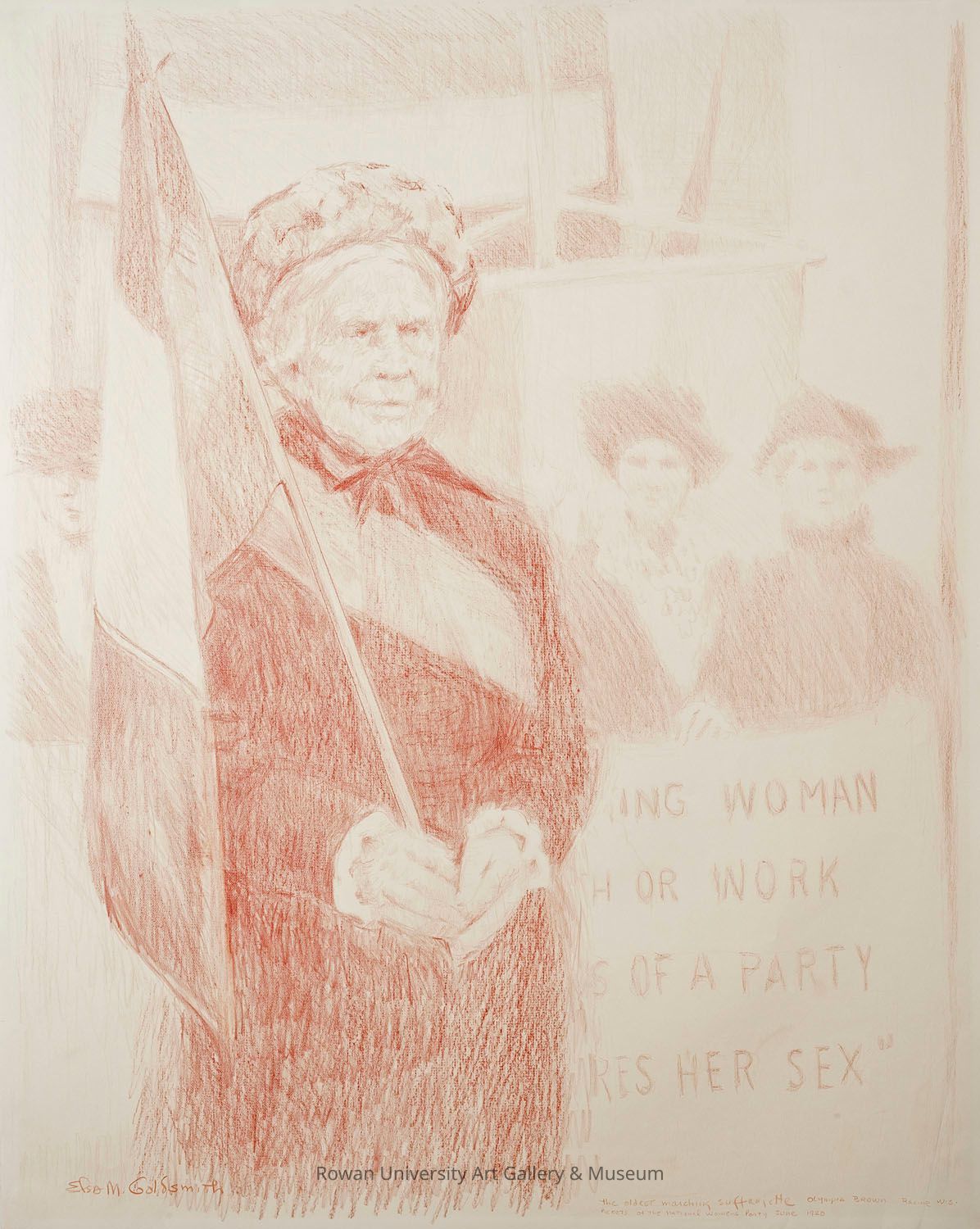 Elsa M. Goldsmith (1920–2005), The Oldest Marcher, from Women on the March Series, 1976–77, Conté crayon on paper, 29 x 23 in. Rowan University Museum of Contemporary Art, Gift of Cris and Jo Ann Goldsmith (2021.66.7). Photo: Karen Mauch Photography.